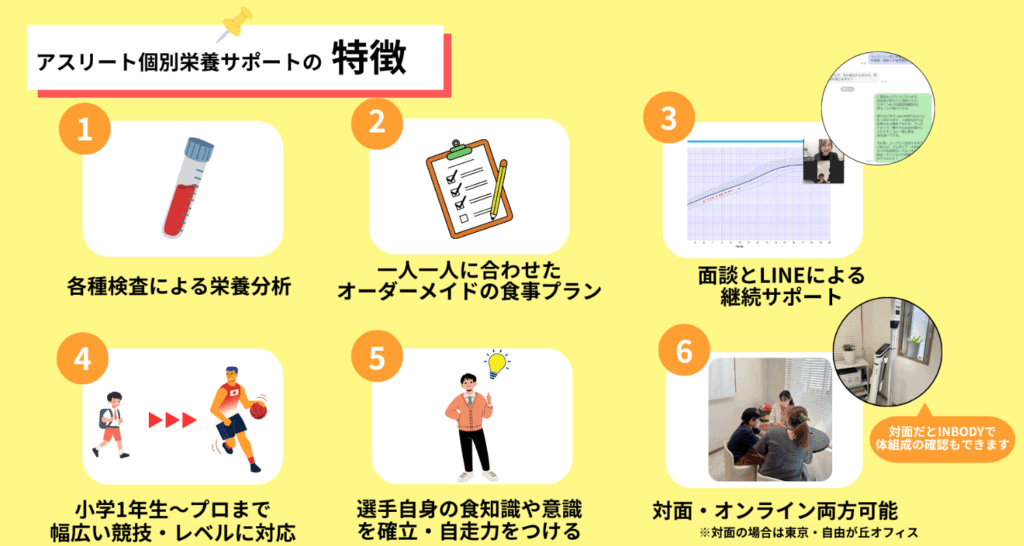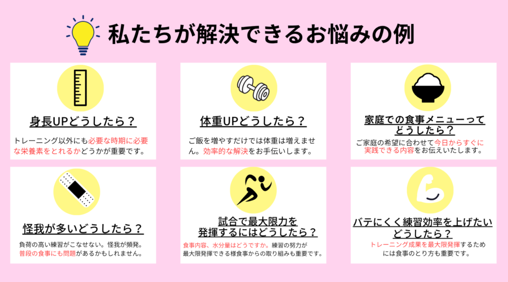 『世界一の笑顔の瞬間を食で作る』をモットーに、アスリート向け栄養指導、個別栄養サポートを手掛ける。代表の喜多みのりは、高校時代怪我の多い選手生活を経験し1人でも多くの選手のパフォーマンスUPを提供したいという思いから活動を始め、2020年9月に会社設立。東京・大阪を中心に全国で小学1年生〜プロまで、目標達成を栄養面からサポートしたアスリートは2,000人を超える。